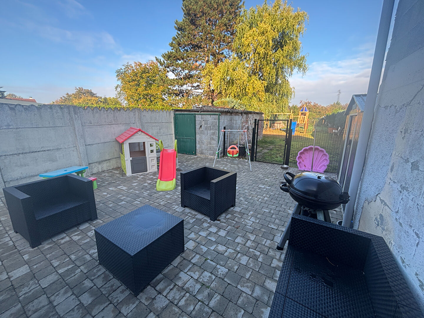 Sur la commune de Vieux-Condé : maison d'environ 116,8 m2 sur et avec 496m2 environ, entièrement rénovée, comprenant au rdc : un hall d'entrée, un salon, une salle à manger, une cuisine équipée et meublée avec coin repas, une buanderie ainsi qu'une salle de bains.